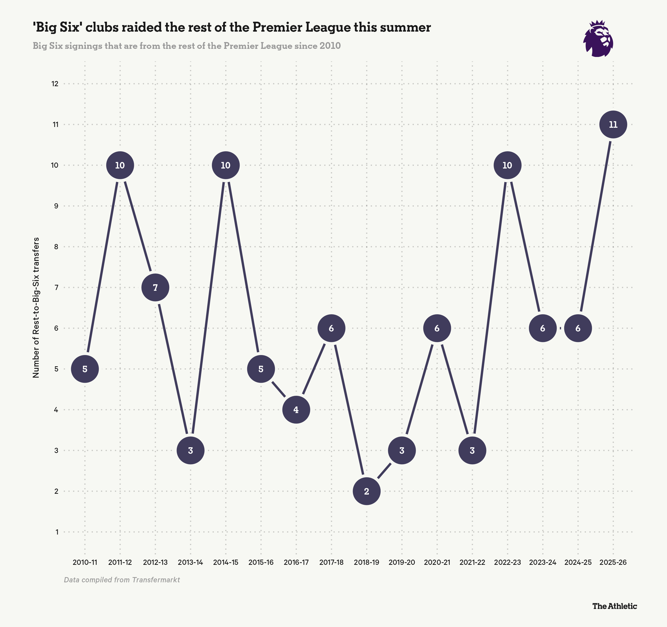 截止日当天,伊萨克终于如愿以偿,在赛季初拒绝为纽卡斯尔出战后,他的愿望得以实现。但在整个转会窗口期间,英超“六大豪门”从联赛内部挑选球员的现象显著增加。对于英格兰顶级联赛中其他14支球队来说,无论是受制于联赛的财务规定,还是单纯的经济现实,过去几周无疑令人清醒。