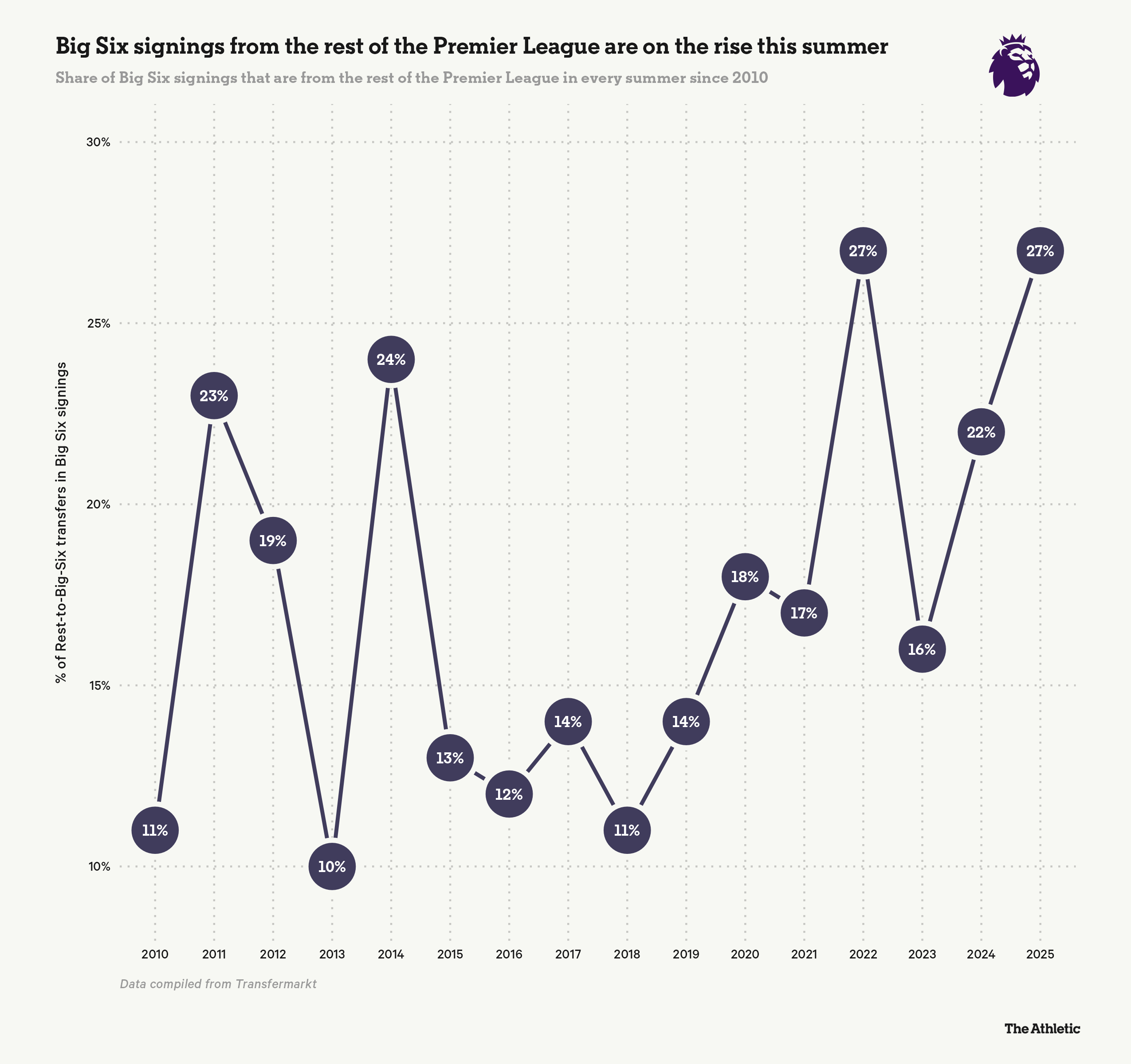 有人会说这一切并不新鲜:大俱乐部一直以来都在掠夺英格兰足球食物链下游的资源。但随着英超财富的激增导致转会市场严重通胀,这类交易变得越来越少。这让非精英俱乐部能够为自己的明星球员设置高昂的要价,促使“六大豪门”转向海外寻找更具性价比——往往也更具质量的选择。