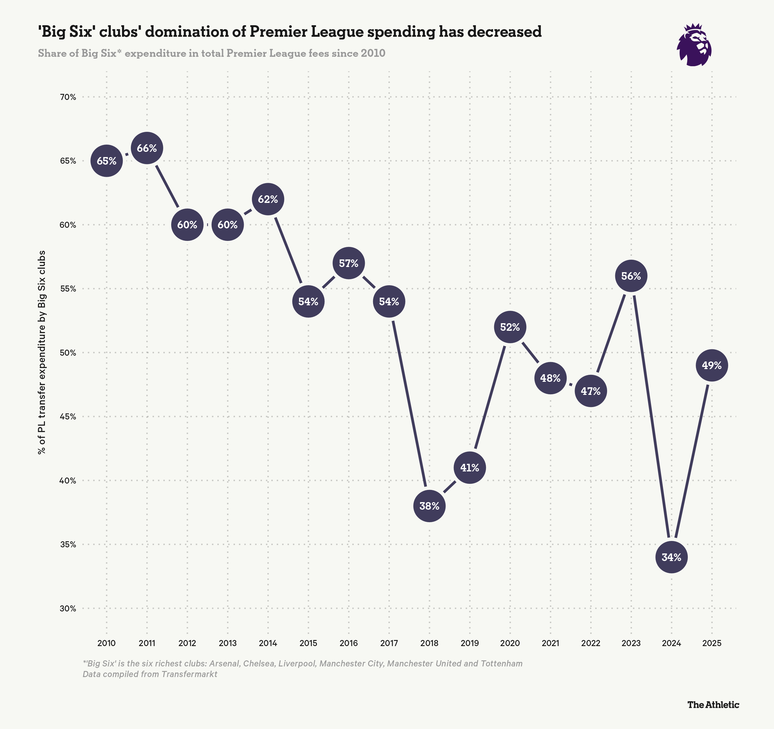 更令人惊讶的是,PSR并没有阻止非传统豪门俱乐部在英超总转会支出中的占比大幅增长。2010-11至2014-15这五个赛季,“六大豪门”的支出占英超总转会支出的60%到66%。这一数字在2018-19赛季降至38%,上赛季更是低至34%,不过今年夏天又回升至49%。