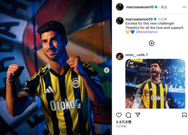 今日阿森西奥在社媒晒出了自己身穿费内巴切球衣的亮相照,并配文写道:“很高兴迎来这次全新的挑战!感谢你们的爱与支持。@费内巴切”
